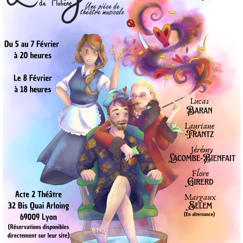 Retrouvez Argan et sa servante Toinette, embarqués dans un duel plein d’esprit autour du destin d’Angélique, condamnée à un mariage sans amour. Mais entre une belle-mère intéressée, un notaire cupide et des médecins plus soucieux de profit que de santé, les pièges se multiplient et la confiance devient un terrain glissant. Guidé par la narration de Béralde, le frère d’Argan, le spectateur est invité à redécouvrir cette pièce intemporelle sous un angle inédit. Avec : Lucas BARAN, Lauriane FRANTZ, Flore GIRERD et Jérémy LACOMBE-BIENFAIT